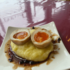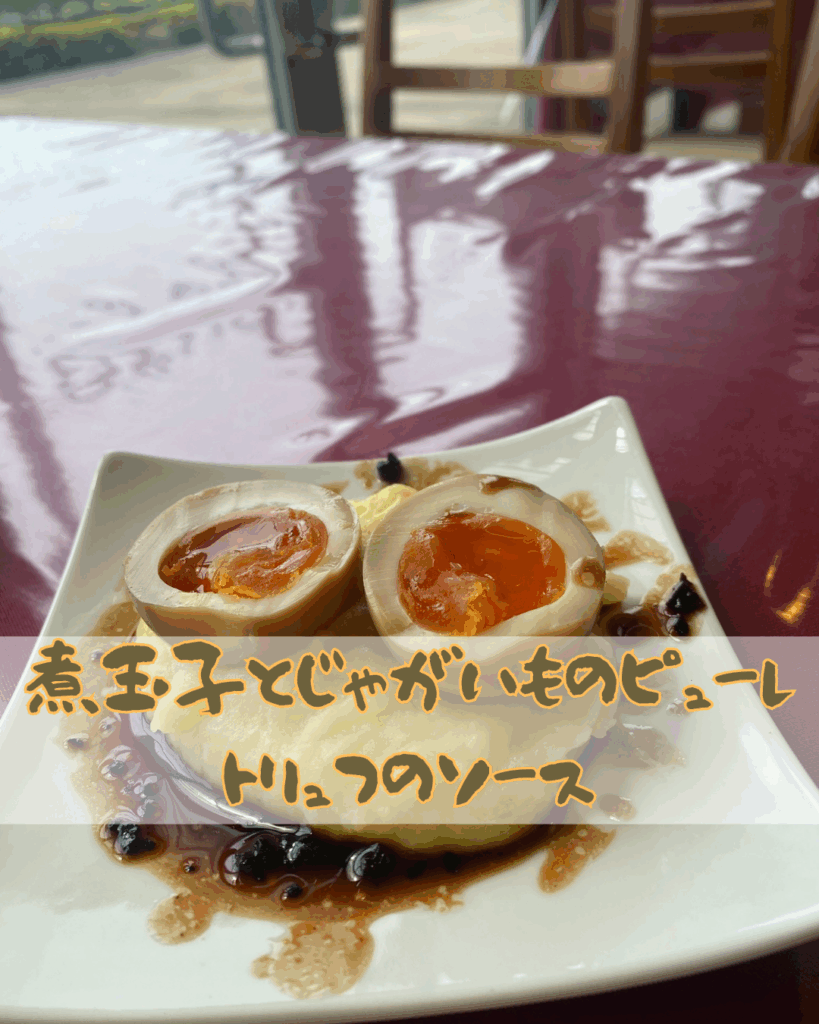 煮玉子とじゃがいものピューレ、トリュフのソース ¥370